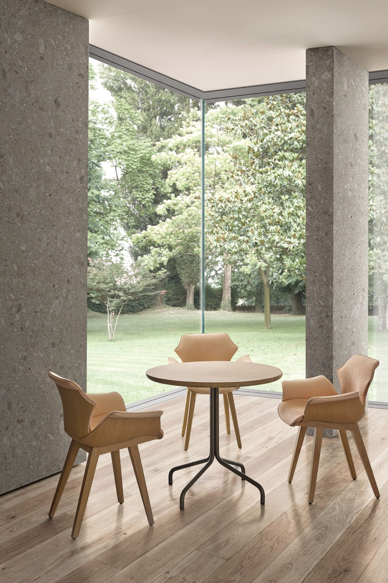 Signature pieces such as the iconic Tractor Stool exemplify the brand’s unique ability to reimagine archetypal forms with a modern sensibility its ergonomic, hand-finished walnut seat evokes both familiarity and innovation. The Spoke Dining Table, with its elegantly jointed legs and elliptical glass top, and the Brutus Chair, a study in the interplay of monumentality and lightness through its Vienna cane back and walnut frame, further illustrate BassamFellows’ mastery of form and function. Each piece is a testament to the brand’s “total design” philosophy, where furniture is conceived as an integral element of a cohesive architectural and interior narrative .